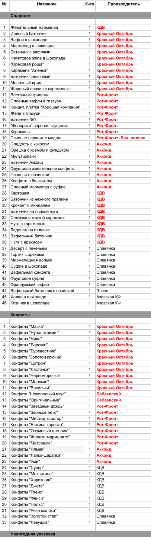 Ирисный батончик (1 шт), Вафли в шоколаде (1 шт), Мармелад в шоколаде (1 шт), Батончик с вафлями (1 шт), Фруктовое желе в шоколаде (1 шт), "Ореховая роща" (1 шт), Карамель "Аленка" (1 шт), Батончик сливочный (1 шт), Молочный ирис (1 шт), Жареный арахис с карамелью (1 шт), Конфеты "Маска" (1 шт), Конфеты "Ну-ка отними!" (1 шт), Конфеты "Нива" (1 шт), Конфеты "Барокко" (1 шт), Конфеты "Буревестник" (1 шт), Конфета "Золотой ключик" (1 шт), Конфеты "Цитрон" (1 шт), Конфеты "Ласточка" (1 шт), Конфеты "Черноморочка" (1 шт), Конфеты "Морские" (1 шт), Конфеты "Васильки" (1 шт)