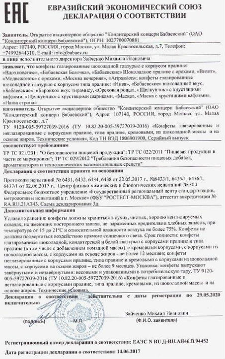 Сертификаты соответствия на конфеты "Бабаевский"