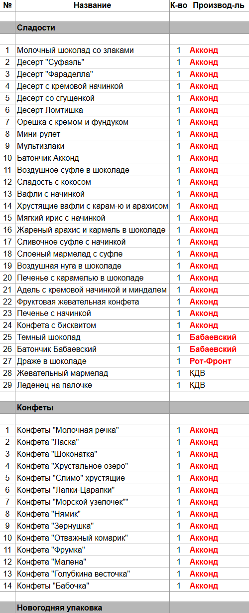 Молочный шоколад со злаками (1 шт), Десерт "Суфаэль" (1 шт), Десерт "Фараделла" (1 шт), Десерт с кремовой начинкой (1 шт), Десерт со сгущенкой (1 шт), Десерт Ломтишка (1 шт), Орешка с кремом и фундуком (1 шт), Мини-рулет (1 шт), Мультизлаки (1 шт), Батончик Акконд (1 шт), Воздушное суфле в шоколаде (1 шт), Сладость с кокосом (1 шт), Вафли с начинкой (1 шт), Хрустящие вафли с карам-ю и арахисом (1 шт), Мягкий ирис с начинкой (1 шт), Жареный арахис и кармель в шоколаде (1 шт), Cливочное суфле с начинкой (1 шт), Слоеный мармелад с суфле (1 шт), Воздушная нуга в шоколаде (1 шт), Печенье с карамелью в шоколаде (1 шт), Адель с кремовой начинкой и миндалем (1 шт), Фруктовая жевательная конфета (1 шт), Печенье с начинкой (1 шт), Конфета с бисквитом (1 шт), Конфеты "Молочная речка" (1 шт), Конфета "Ласка" (1 шт), Конфета "Шоконатка" (1 шт), Конфета "Хрустальное озеро" (1 шт), Конфеты "Слимо" хрустящие (1 шт), Конфеты "Лапки-Царапки" (1 шт), Конфеты "Морской узелочек" (1 шт), Конфета "Нямик" (1 шт), Конфета "Зернушка" (1 шт), Конфета "Отважный комарик" (1 шт), Конфета "Фрумка" (1 шт), Конфета "Малена" (1 шт), Конфета "Голубкина весточка" (1 шт), Конфеты "Бабочка" (1 шт)