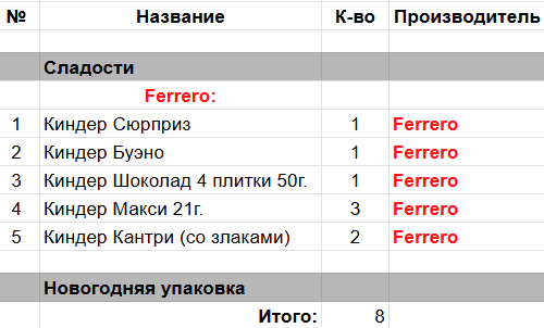Киндер Сюрприз (1 шт), Киндер Буено (1 шт), Киндер Шоколад 4 плитки 50 гр. (1 шт), Киндер Макси 21 гр. (3 шт), Киндер Кантри (со злаками) (2 шт)