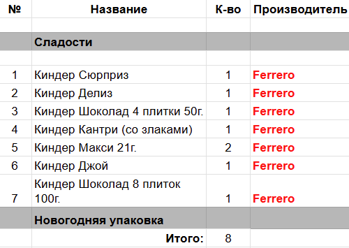 Киндер Сюрприз (1 шт), Киндер Делиз (1 шт), Киндер Шоколад 4 плитки 50 гр. (1 шт), Киндер Кантри (со злаками) (1 шт), Киндер Макси 21 гр. (2 шт), Киндер Джой (1 шт), Киндер Шоколад 8 плиток 50 гр. (1 шт)